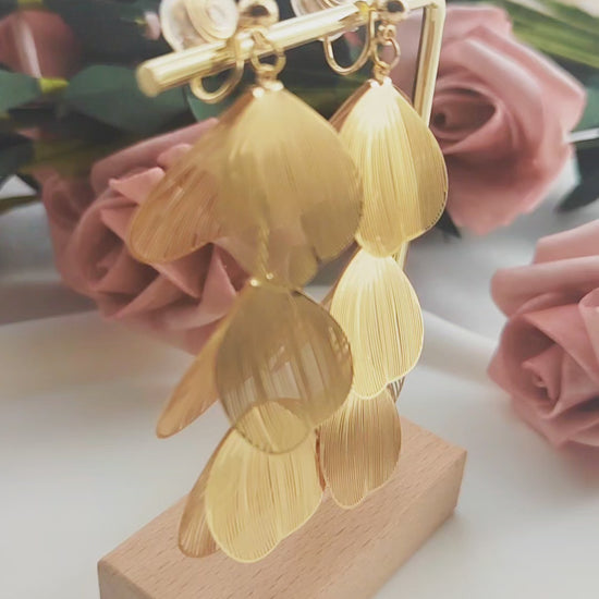 Elegant gold heart leaf tassel clip-on earrings designed for non-pierced ears. Lightweight, comfortable, and effortlessly refined.